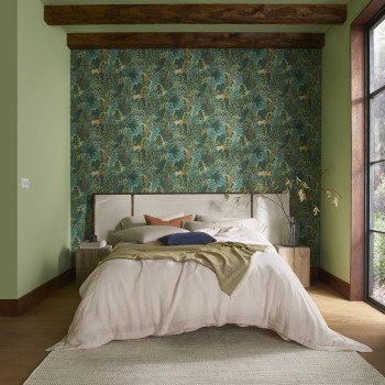 Green non-woven wallpaper, wild nature motif - trees, leaves, flowers.