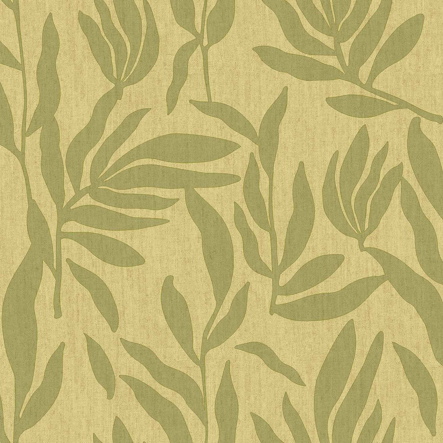 Luxury light beige non-woven wallpaper with vinyl surface, motif of twigs with leaves in green. Interior photo is for illustration only - different colours.