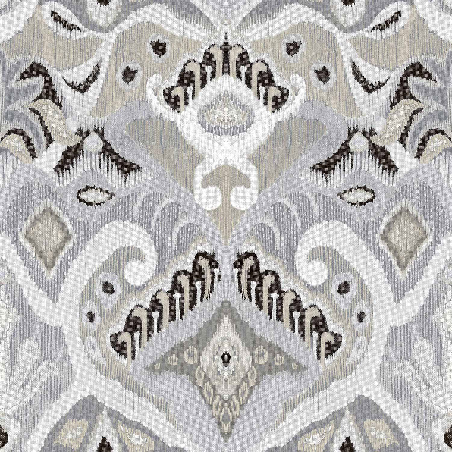 Luxury gray non-woven wallpaper with vinyl surface, geometric motif evoking ethnic pattern, shades of gray, beige and black, texture of stripes.
