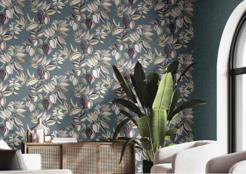 Luxury pale blue non-woven wallpaper with vinyl surface, leaf motifs, shades of beige and brown, fabric texture.