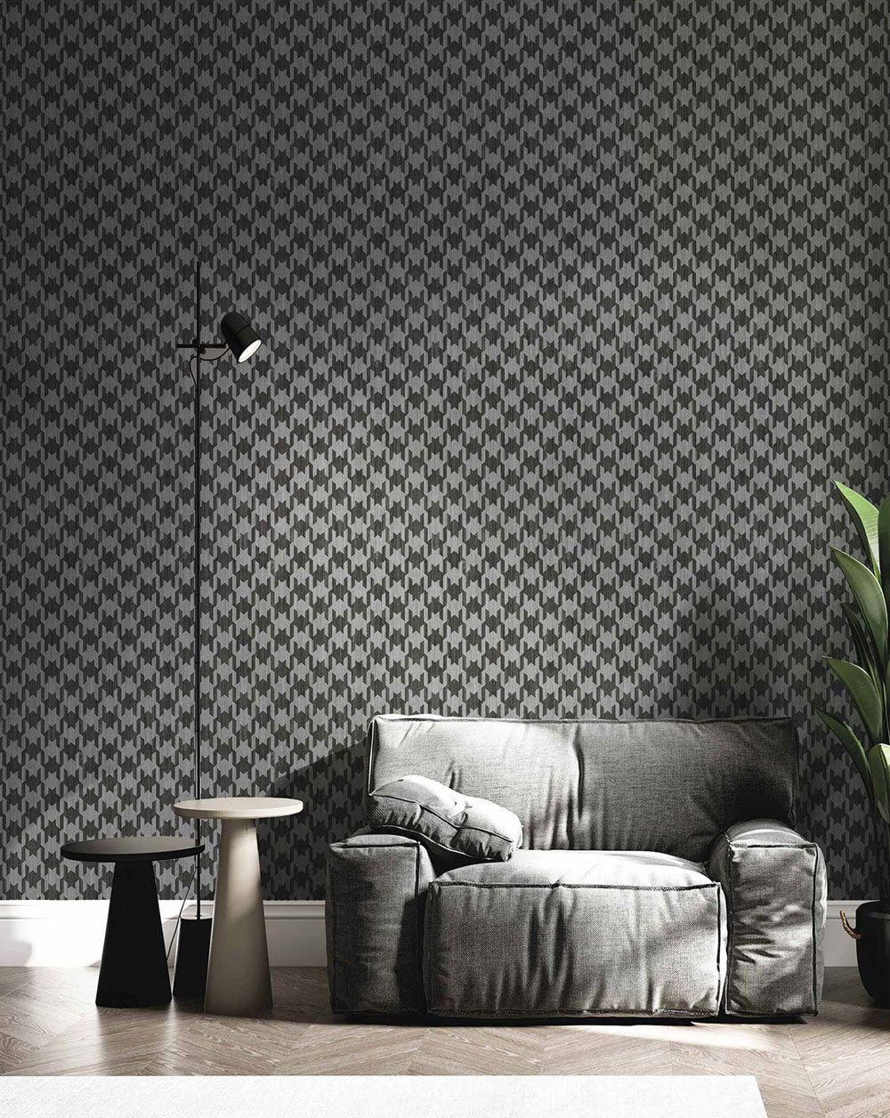 Luxury finely textured non-woven wallpaper with vinyl surface, rooster foot printpattern in shades of black.