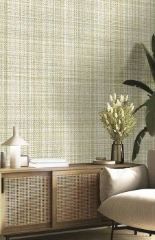 Luxury wallpaper with vinyl surface, imitation of coarse fabric, shades of beige, green and blue, fabric texture.
