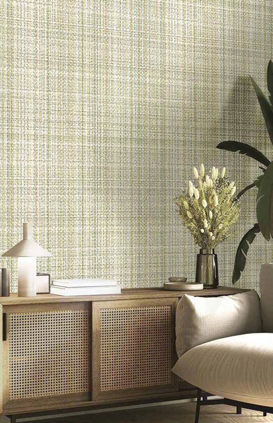 Luxury sand colored non-woven wallpaper with vinyl surface, coarser fabric texture.