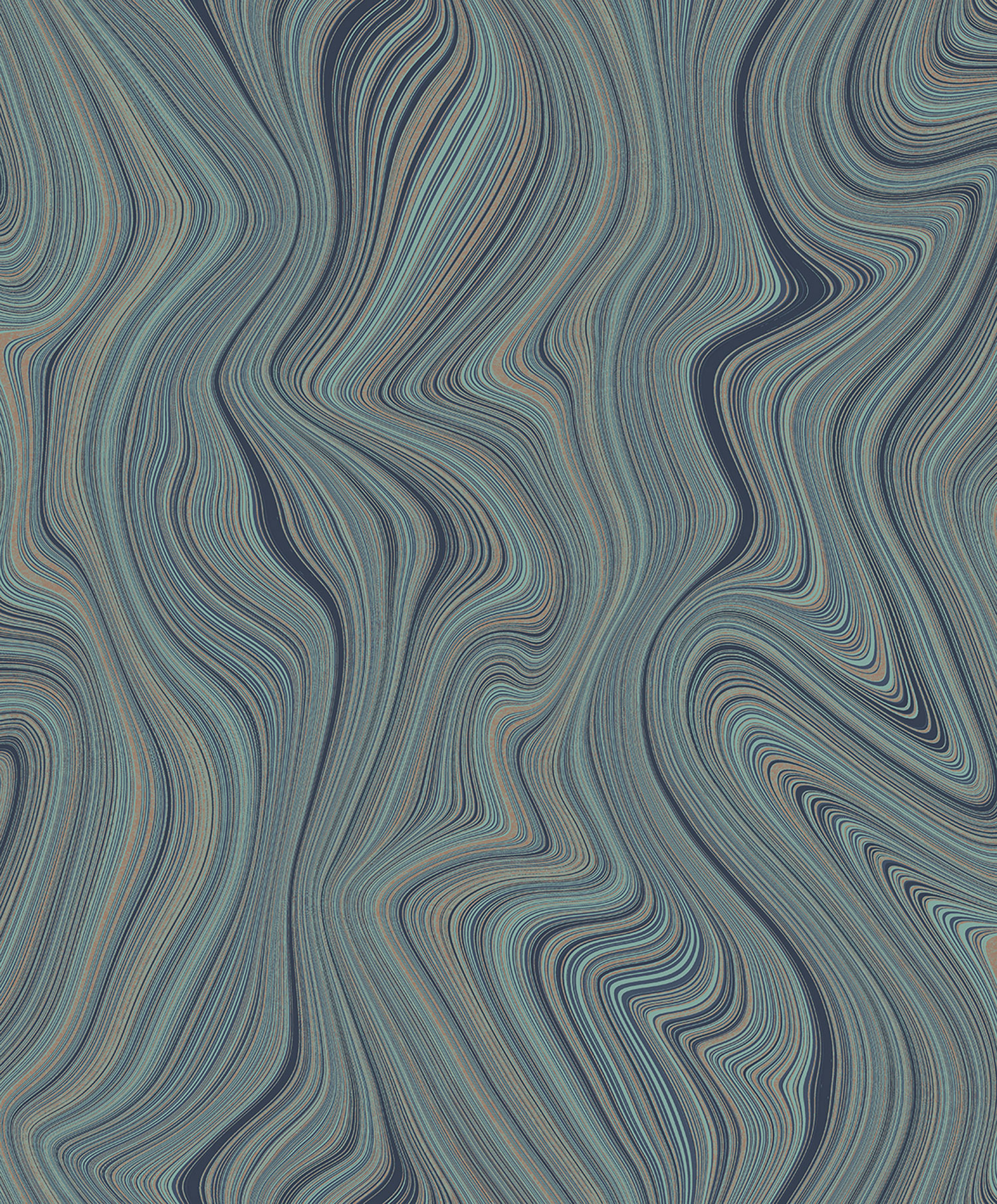 Non-woven wallpaper with vinyl surface, effective lines in shades of green, blue and metallic silver.