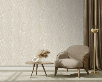 Non-woven wallpaper with vinyl surface, effective semi-glossy lines in natural shades/grey, cream, beige.