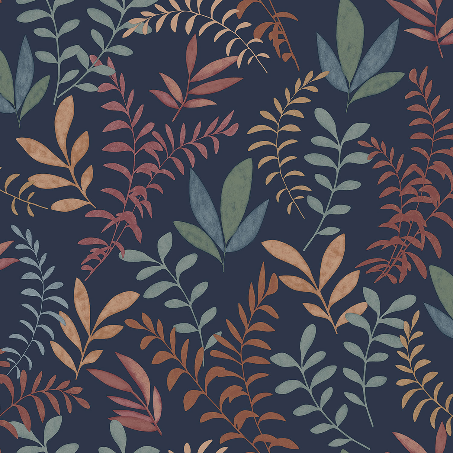 Non-woven wallpaper with vinyl surface, blue background, twigs and leaves in shades of green, blue, beige and terracotta.