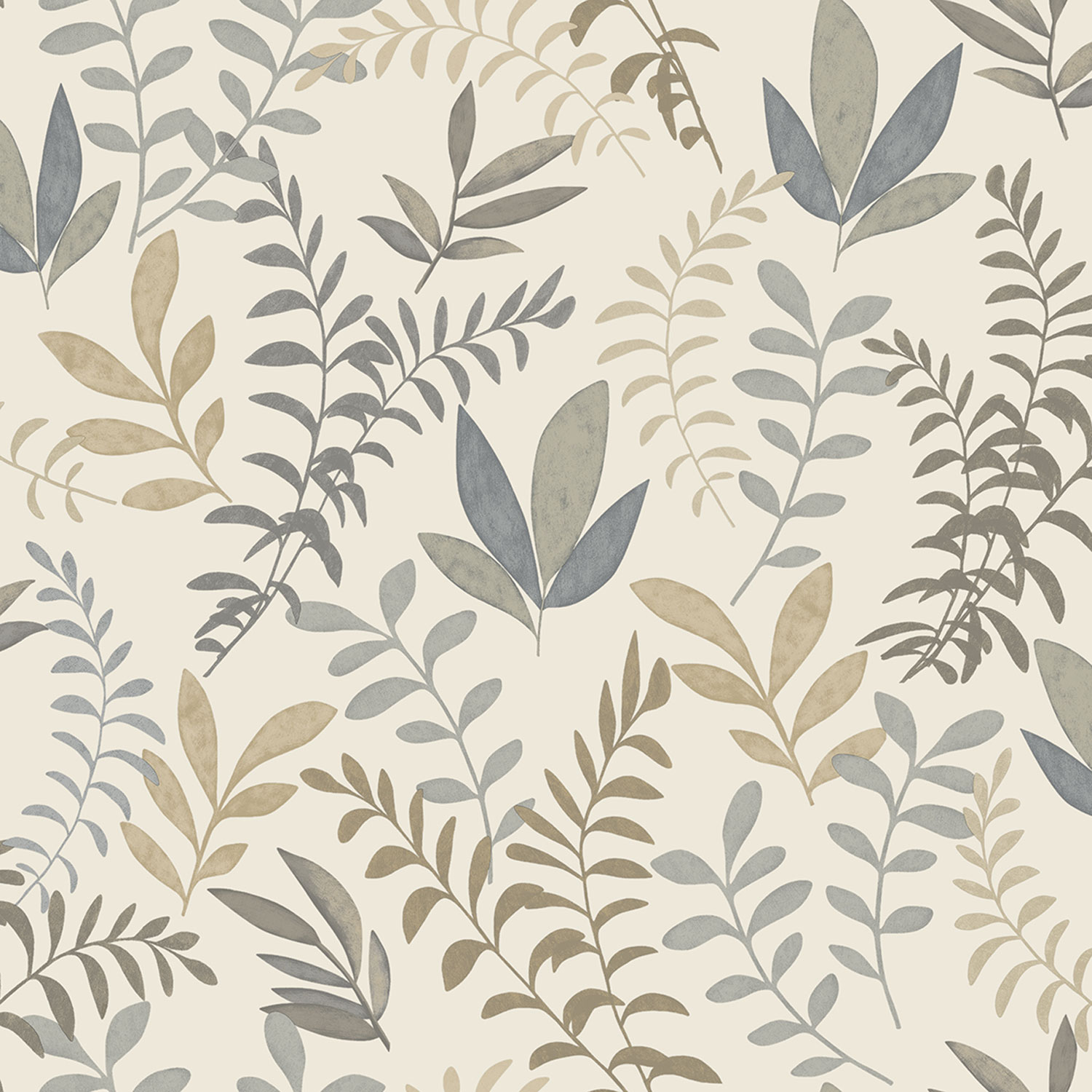 Non-woven wallpaper with vinyl surface, white background, twigs and leaves in shades of grey, grey-blue, beige and brown.