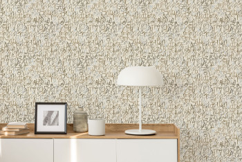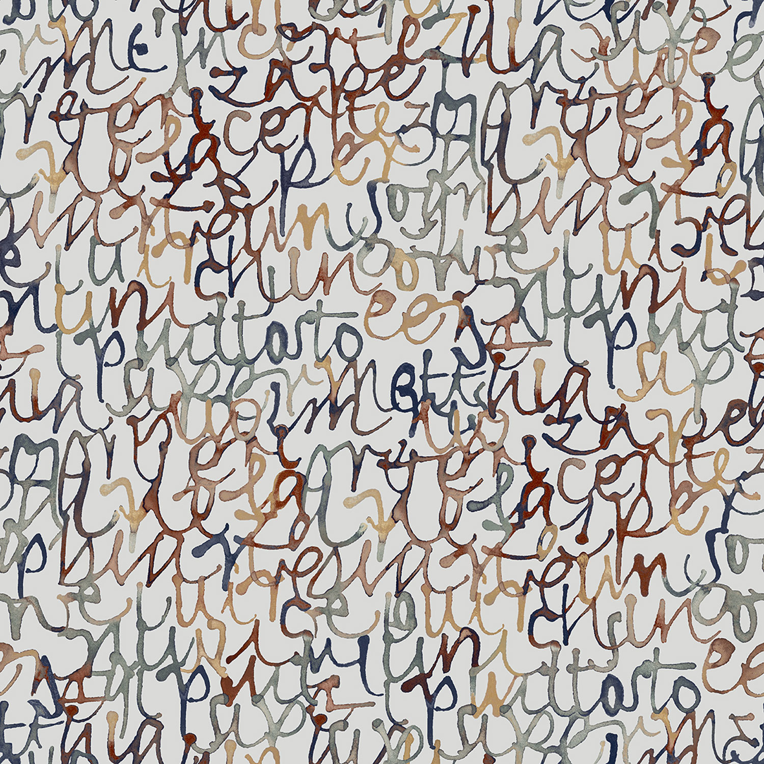 Non-woven wallpaper with vinyl surface, grey-blue background, abstract brush lettering in shades of blue, green, ochre and burgundy.