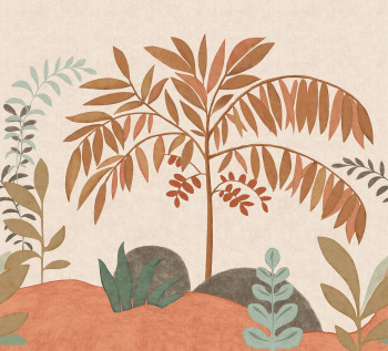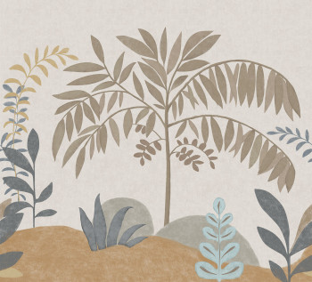 Non-woven wallpaper with vinyl surface, landscape motif in shades of brown and green.