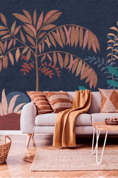 Non-woven wallpaper with vinyl surface, landscape motif in shades of blue and brown.