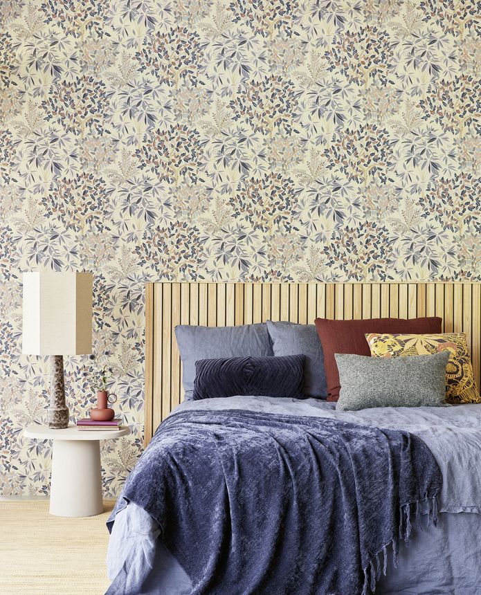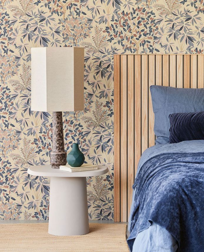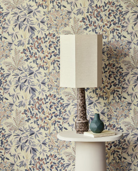 Beige, finely textured, non-woven wallpaper, twigs and leaves in shades of pink, blue, lilac and brown.
