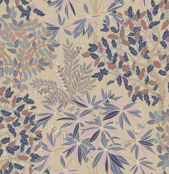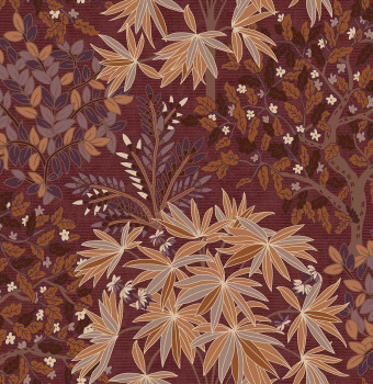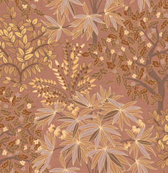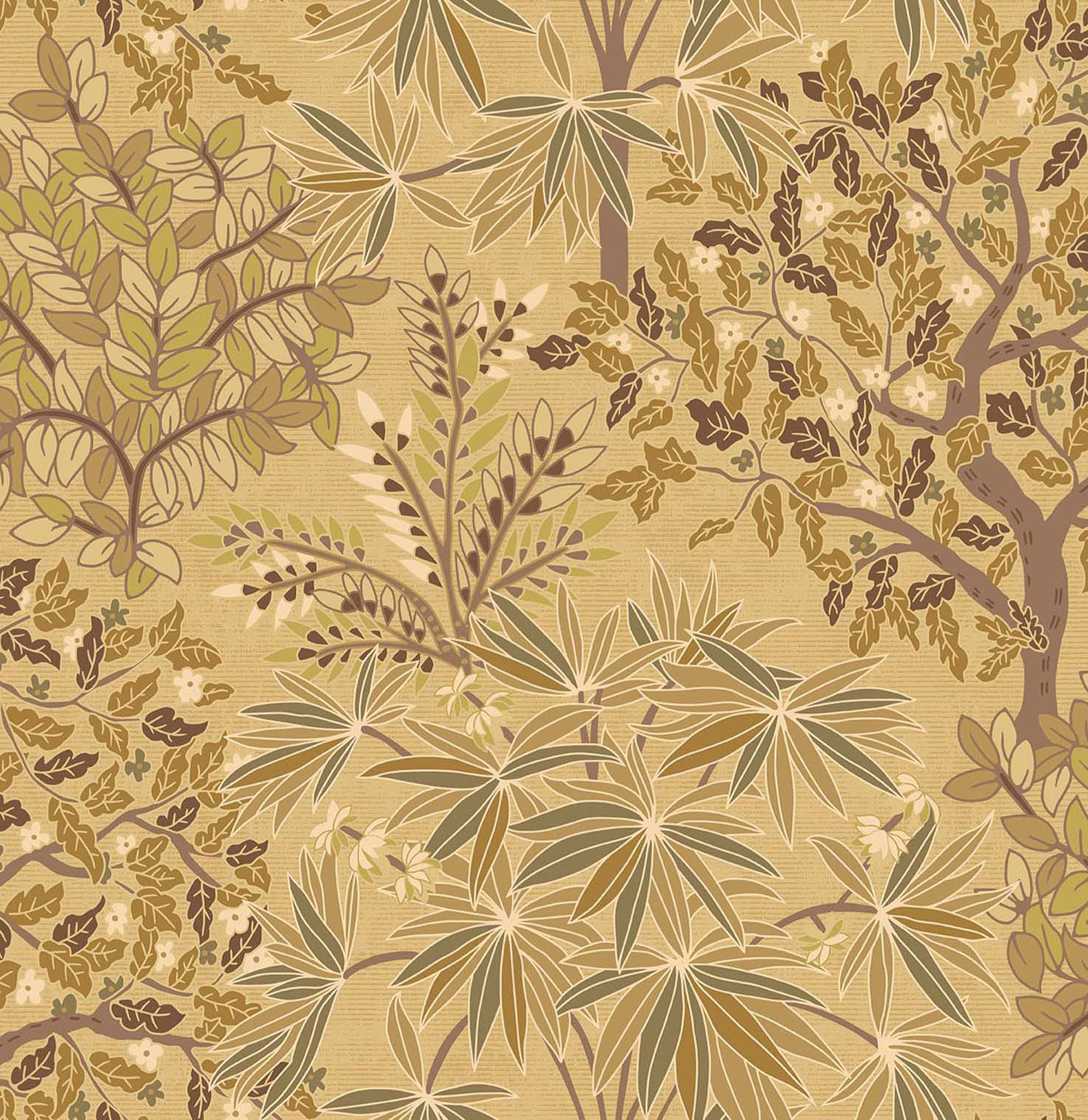 Ochre, finely textured, non-woven wallpaper, twigs and leaves in shades of brown, beige, khaki and brown.