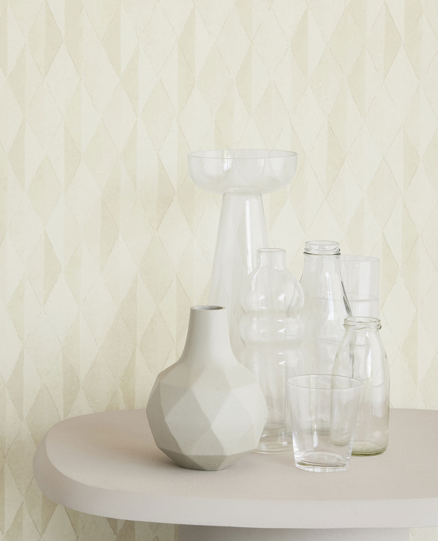 Creamy, geometric non-woven wallpaper, delicately embossed outlines of diamonds.