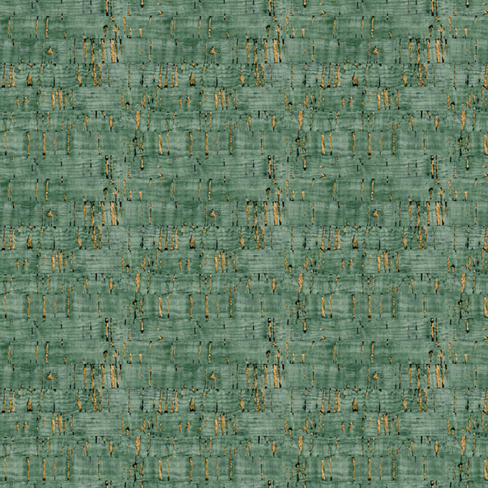 Non-woven wallpaper with vinyl surface, cork imitation, green shades, bronze highlighting.