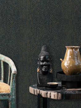 Semi-glossy non-woven wallpaper with vinyl surface, imitation snakeskin in blue-gray shades, metallic gold semi-gloss.