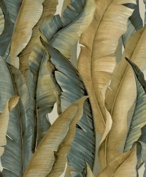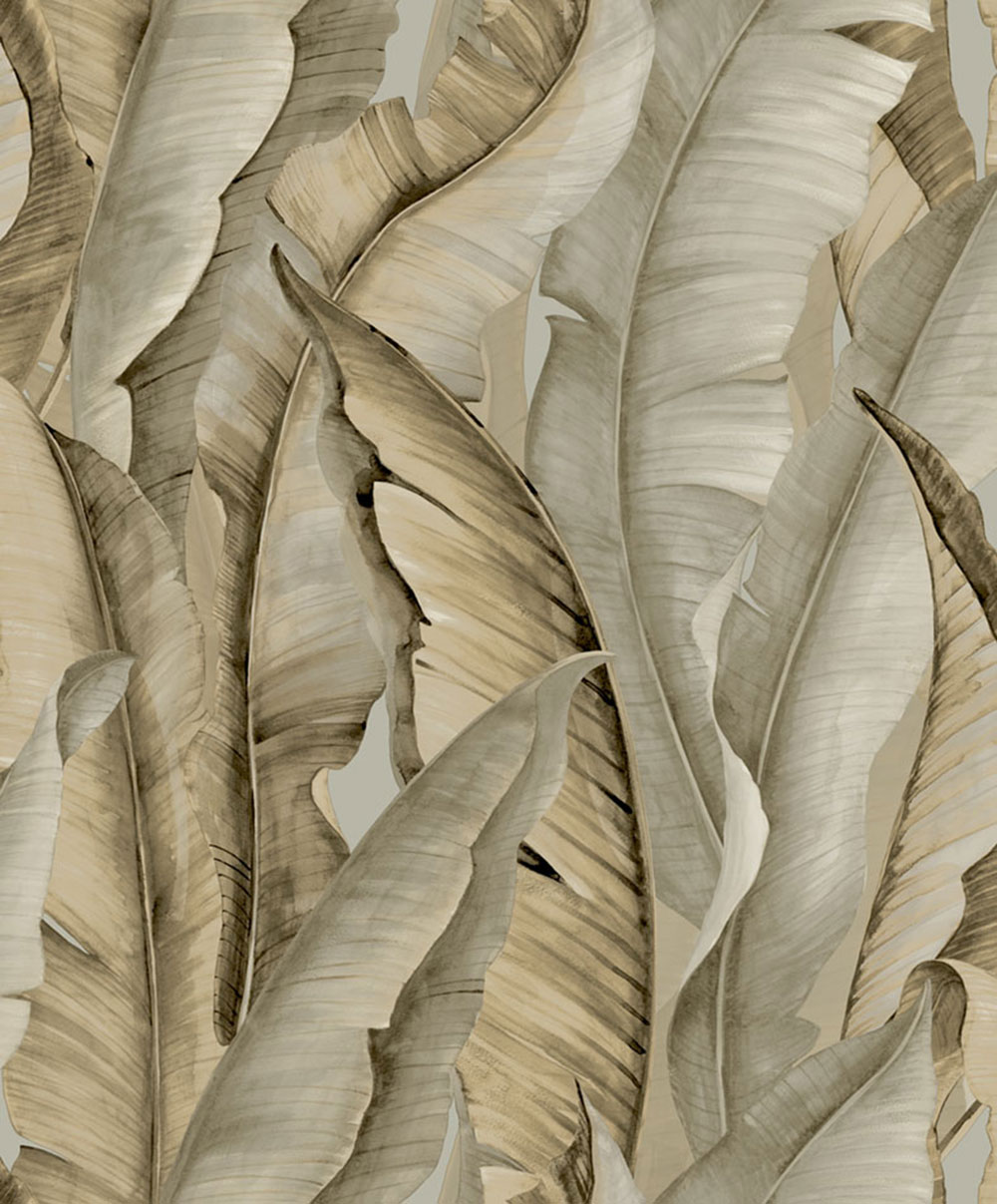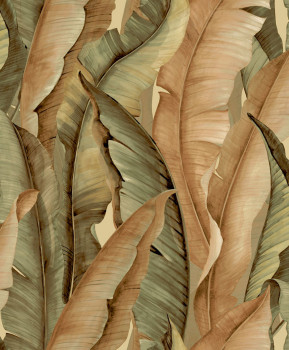 Non-woven wallpaper with vinyl surface, tropical leaves in shades of brown, beige and grey.