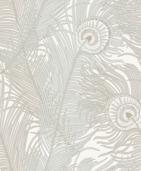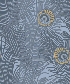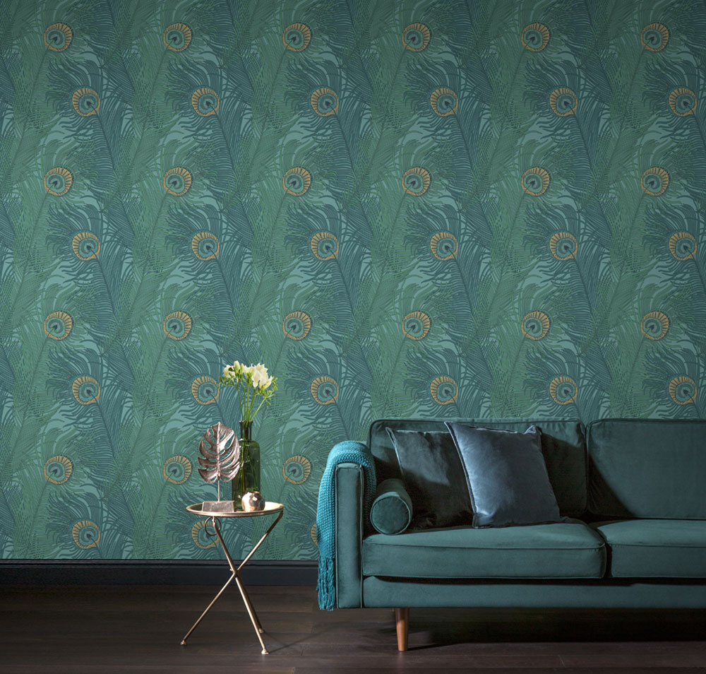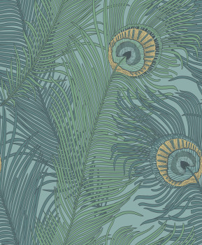 Non-woven wallpaper with a vinyl surface, peacock feather motifs in shades of green, turquoise and metallic gold.