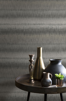 Finely embossed, striped, gray-brown-black, non-woven wallpaper with vinyl surface, metallic silver reflections in places.