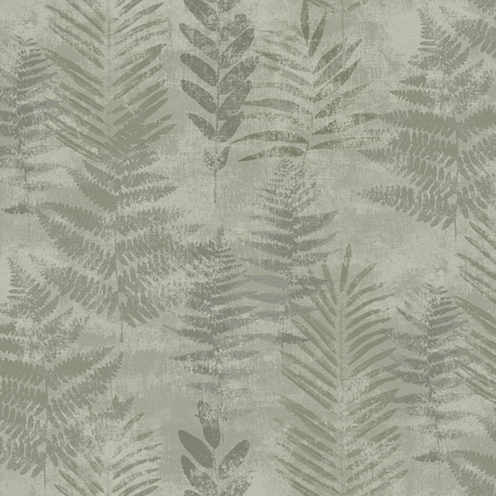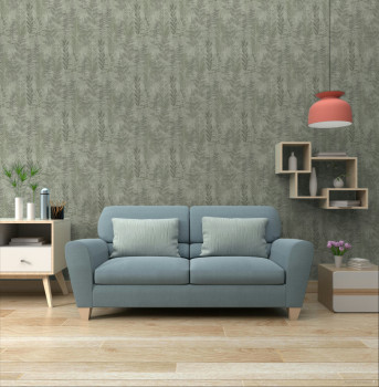 Finely embossed green non-woven wallpaper with vinyl surface, motifs of leaves.