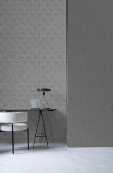 Finely embossed blue-gray geometric non-woven wallpaper with vinyl surface, 3D tiles imitation, silver details.