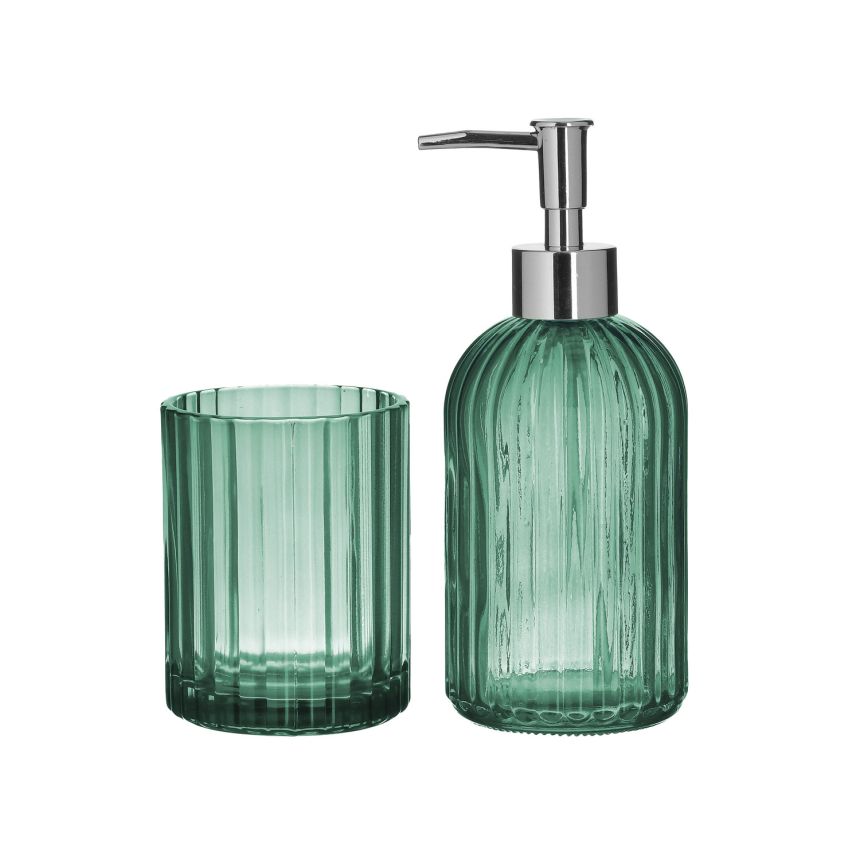 • The set of glass soap dispenser and toothbrush glass in green design is a practical and stylish addition to your bathroom. These bathroom accessories will add a touch of elegance to your bathroom.