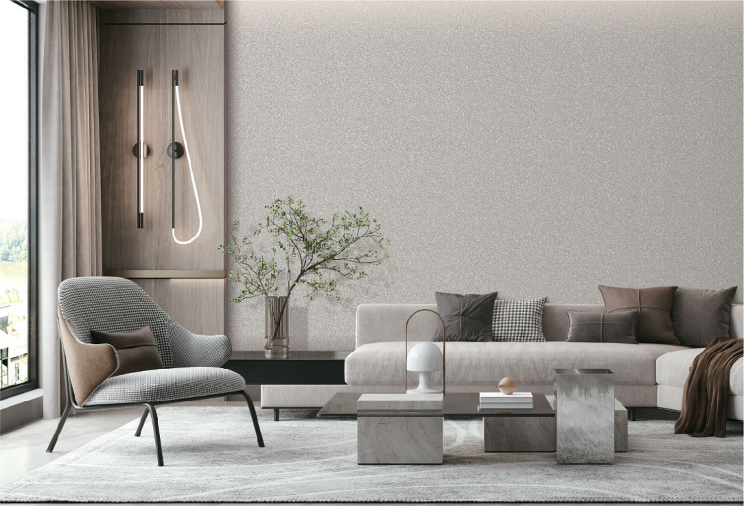 Luxury non-woven wallpaper with a structure of small stones with a delicate shine in gray-beige colour. Non-woven backing, washable vinyl surface.