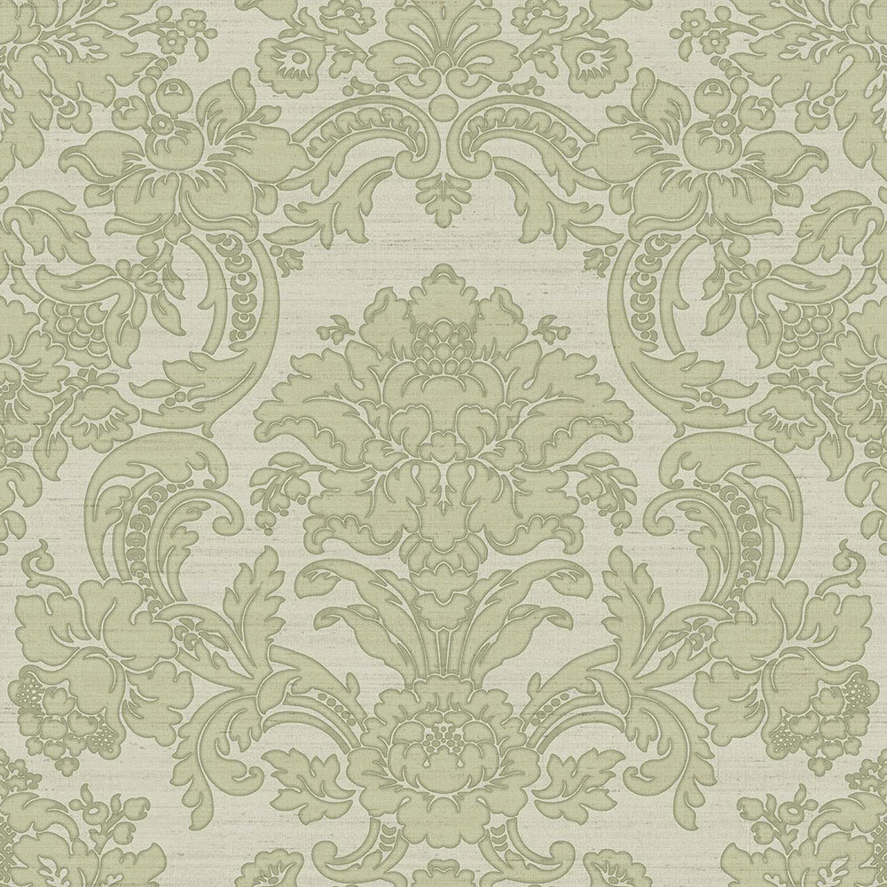Luxury green non-woven wallpaper with vinyl surface, delicately embossed baroque damask pattern.