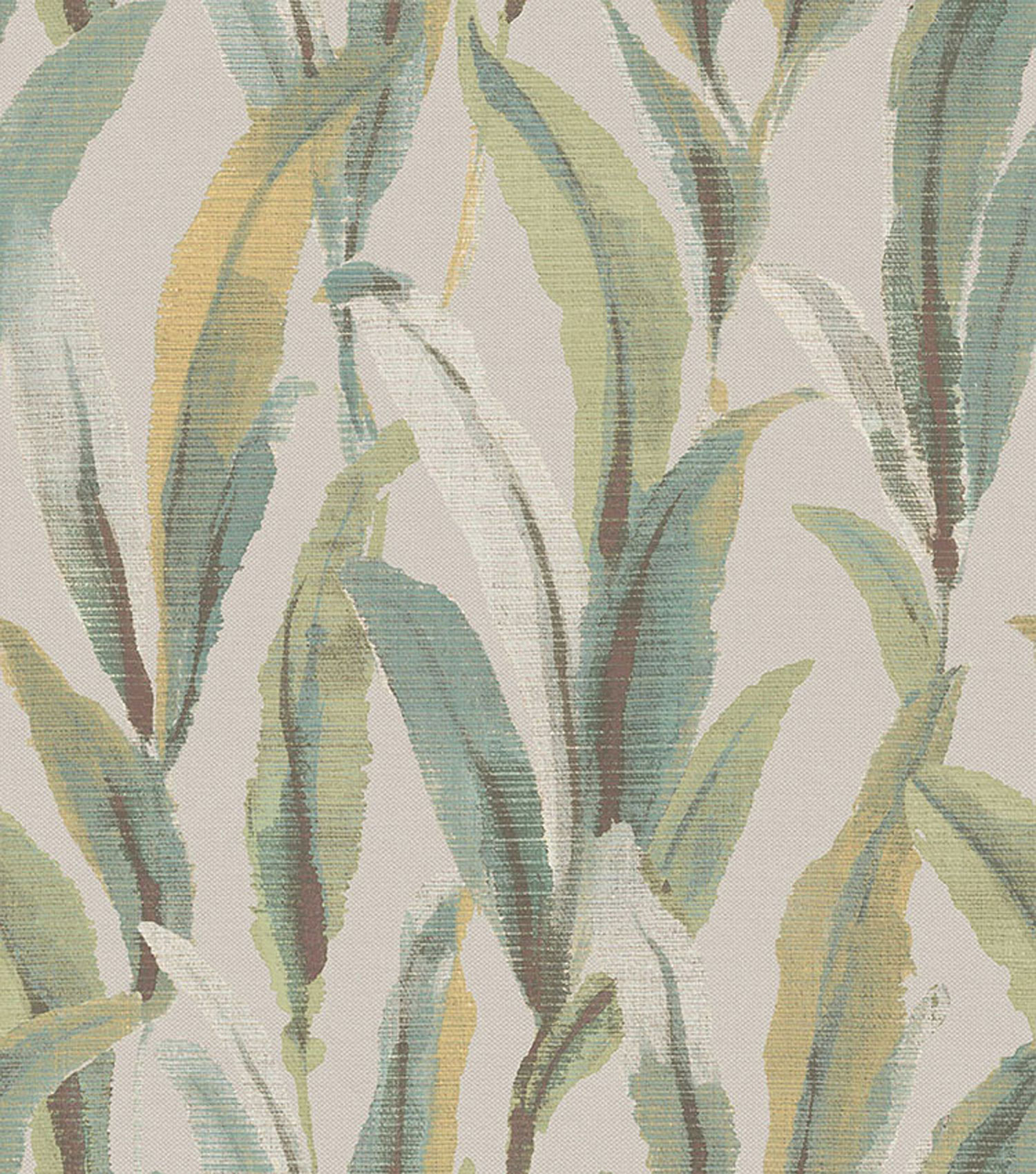 Grey non-woven wallpaper with vinyl surface, leaves in shades of green and golden-beige, fabric texture.