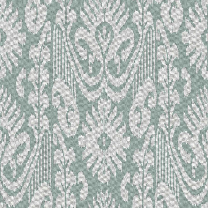 Non-woven wallpaper with vinyl surface, ornamental patterns in grey-blue, beige, brown and gray shades, fabric texture.