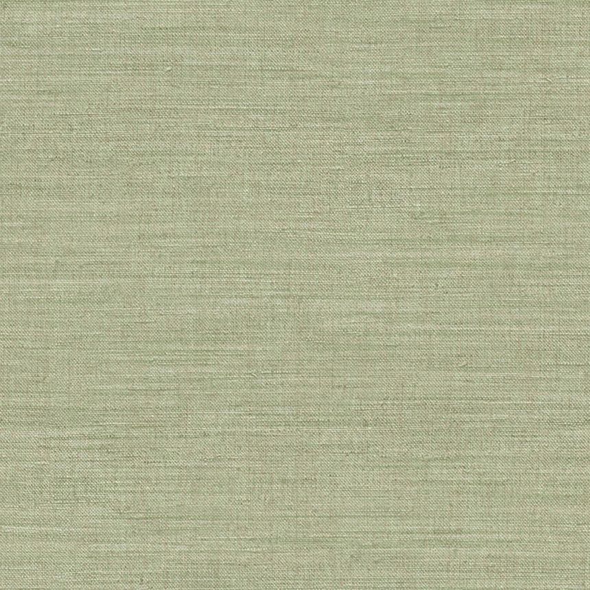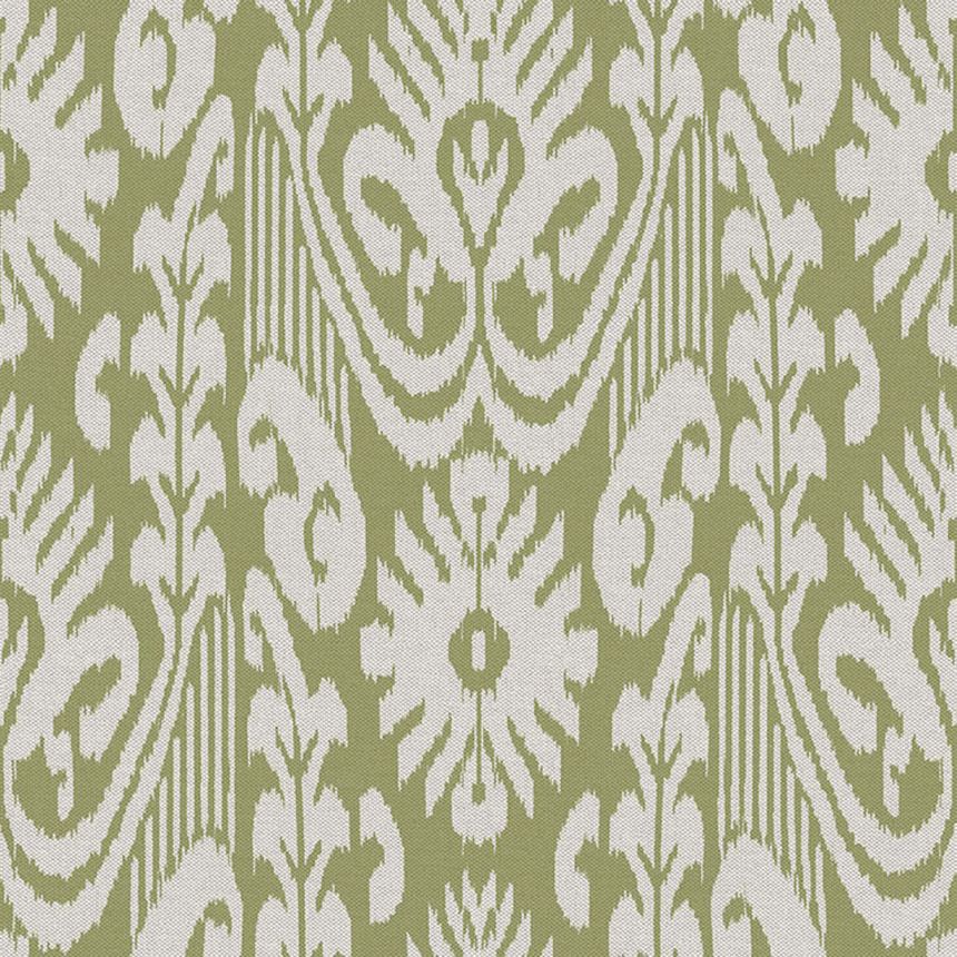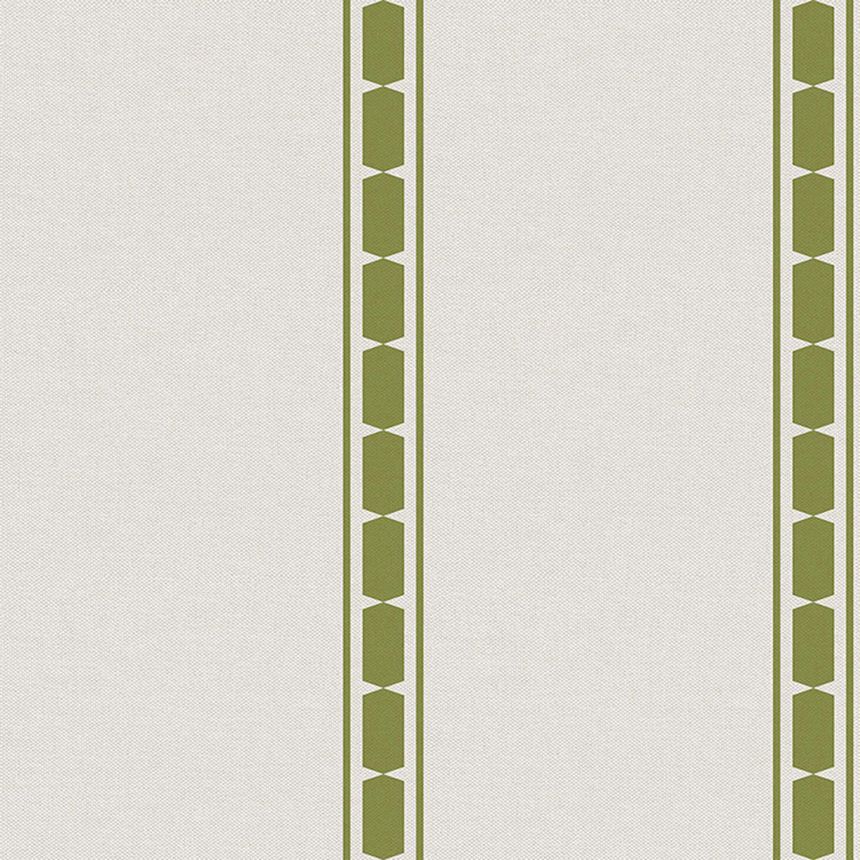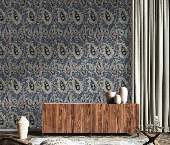 Non-woven wallpaper with vinyl surface, ornamental patterns in shades of green, ocher gold and purple, fabric texture.