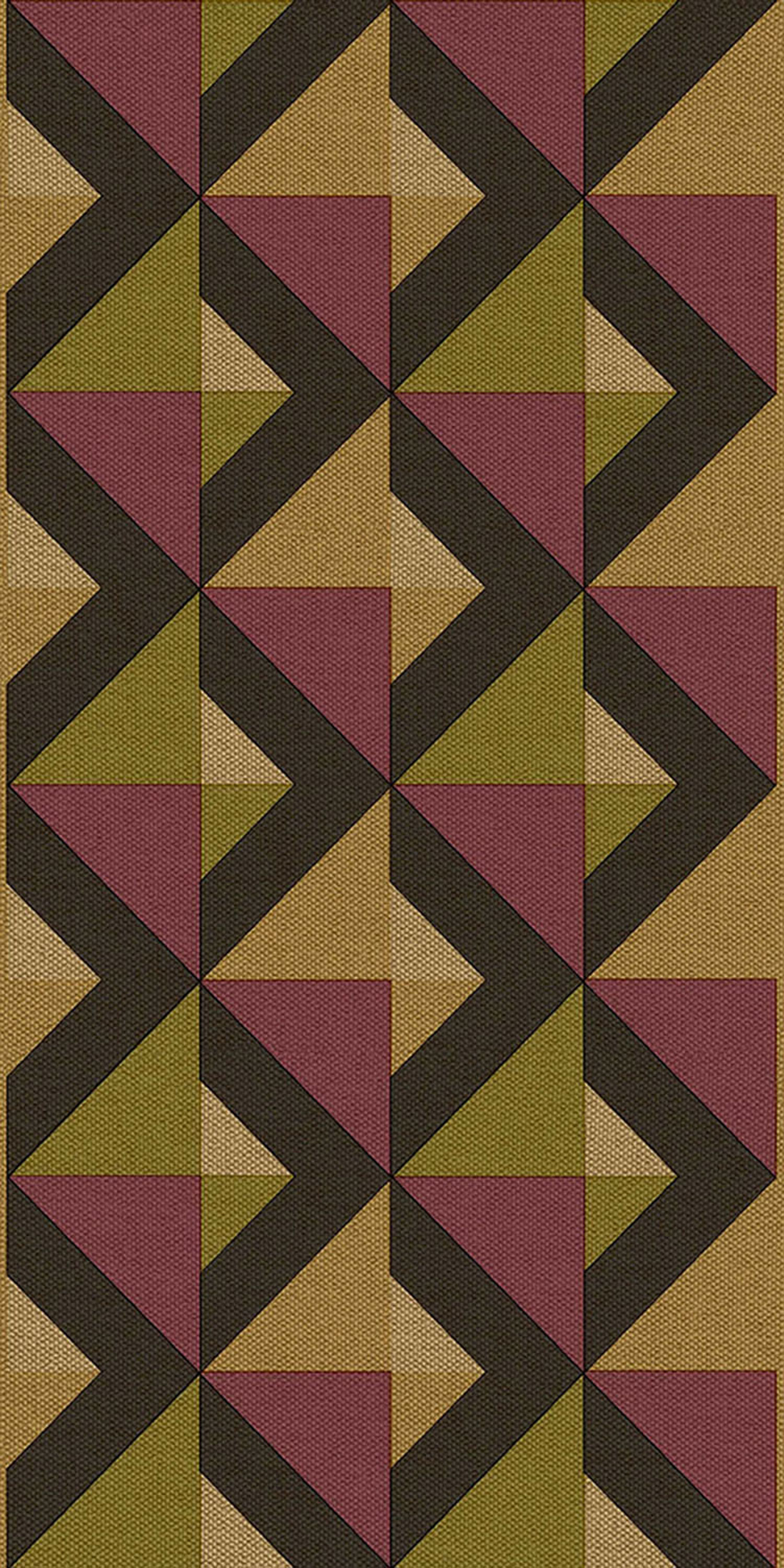 Geometric non-woven wallpaper border with vinyl surface, embossed texture. Shades of burgundy, green, brown and black.