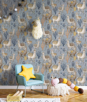 Green non-woven wallpaper, motifs of llamas and cacti.