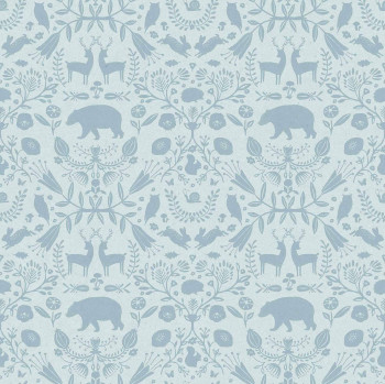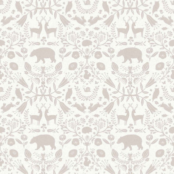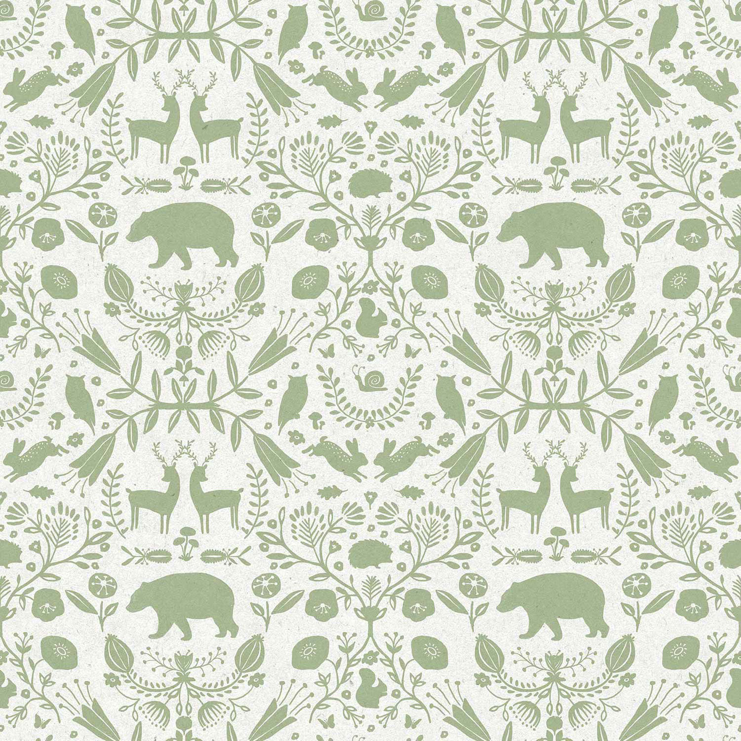 Green-white non-woven wallpaper, motifs of animals and flowers.