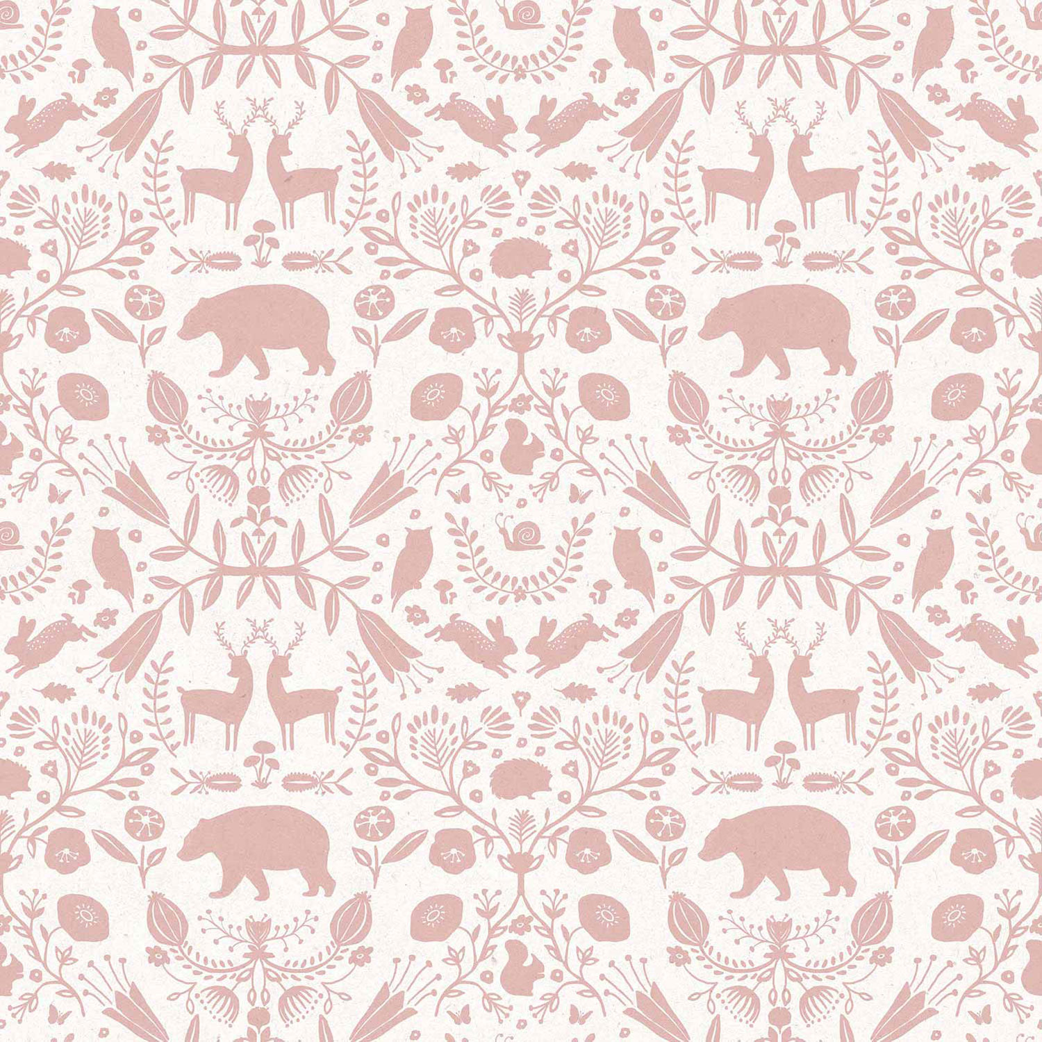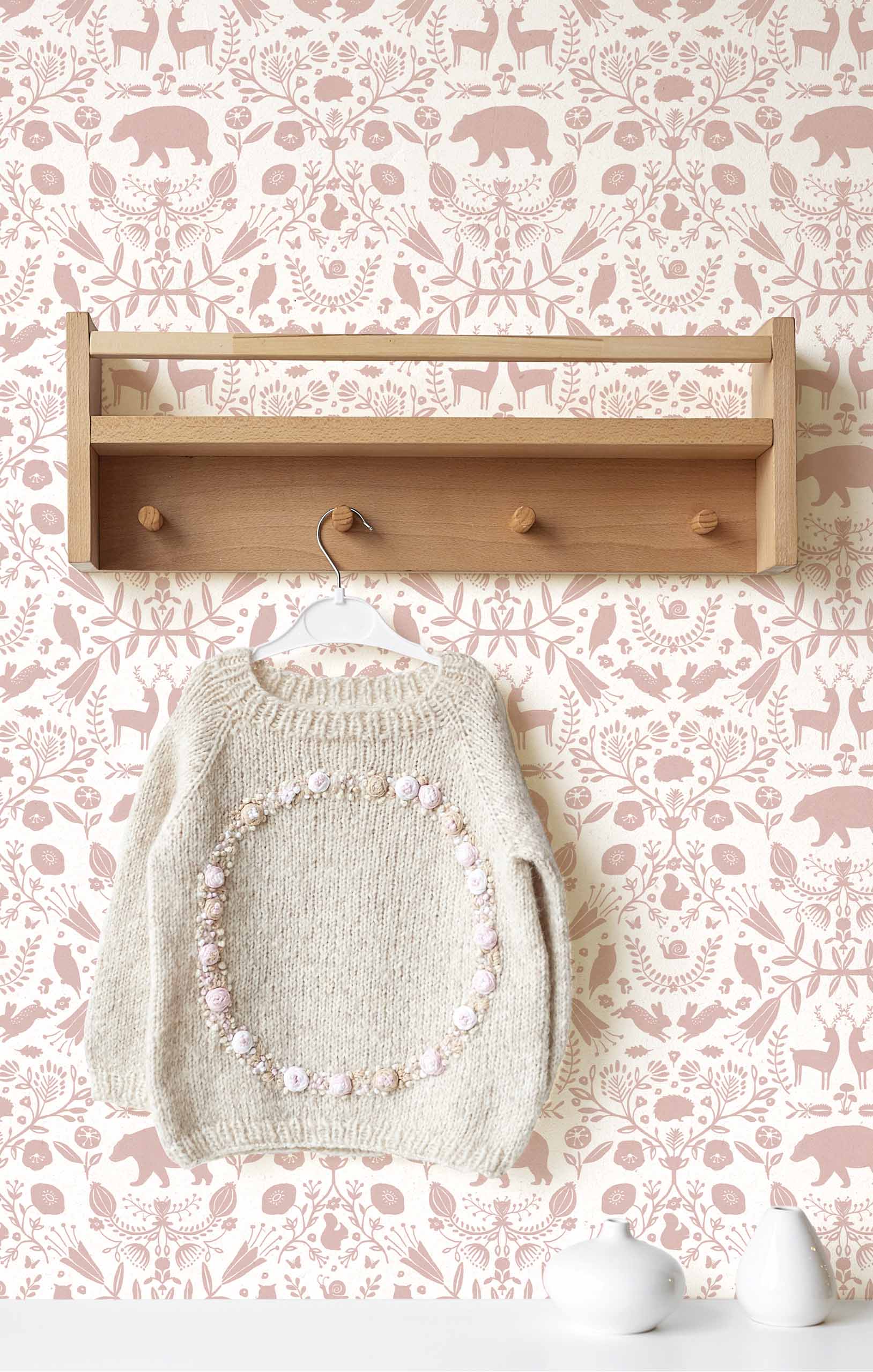 Pink-white non-woven wallpaper, motifs of animals and flowers.