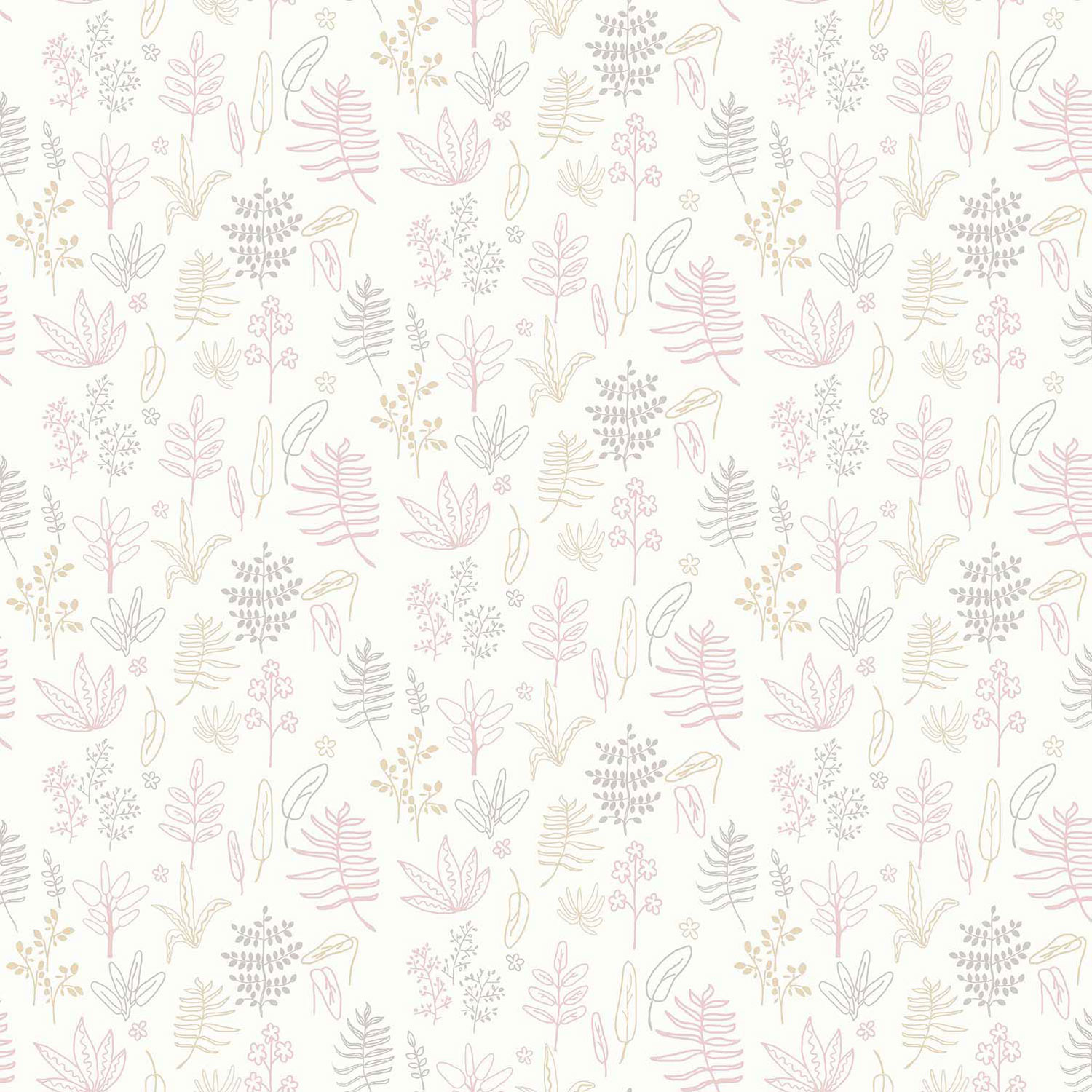 White non-woven wallpaper, leaves and plants in shades of pink, gray and golden-beige.