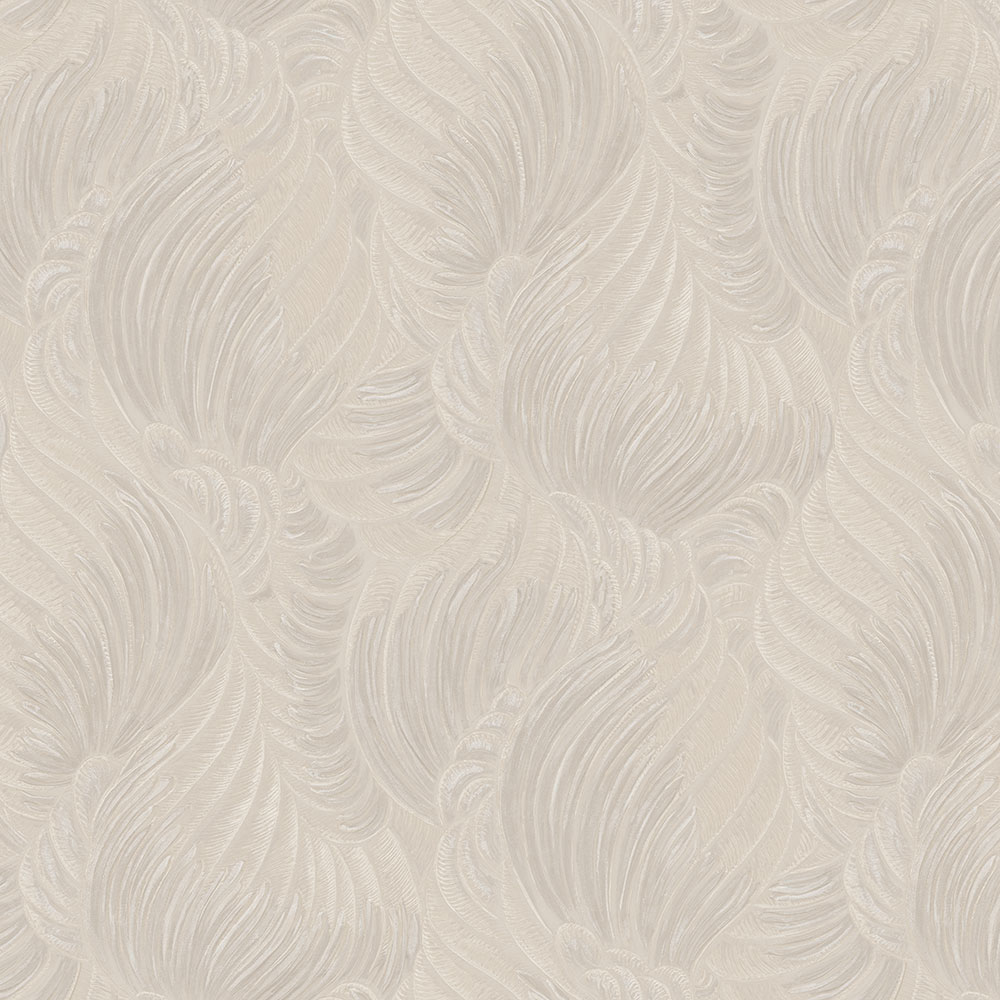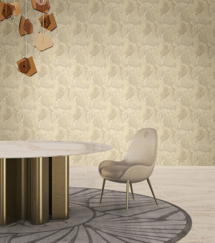 Luxury beige non-woven wallpaper with vinyl surface; embossed, semi-gloss pattern with tiny gold glitters.