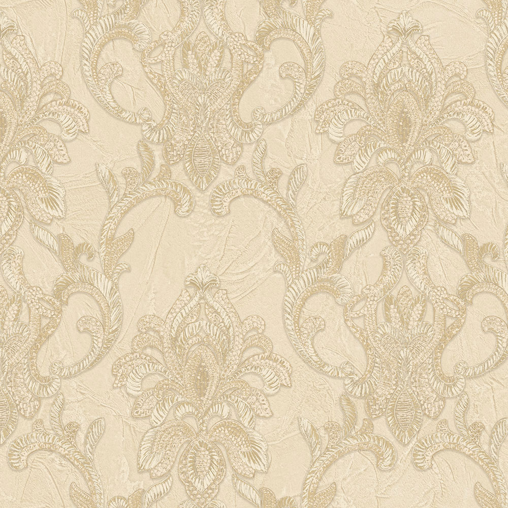 Luxury beige non-woven wallpaper with vinyl surface, gold baroque pattern.