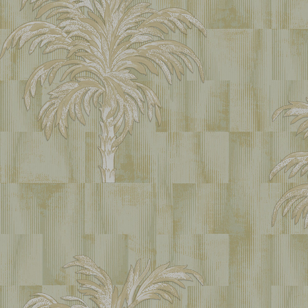 Luxury green non-woven wallpaper with vinyl surface, thicker stripe texture, palm tree motif.
