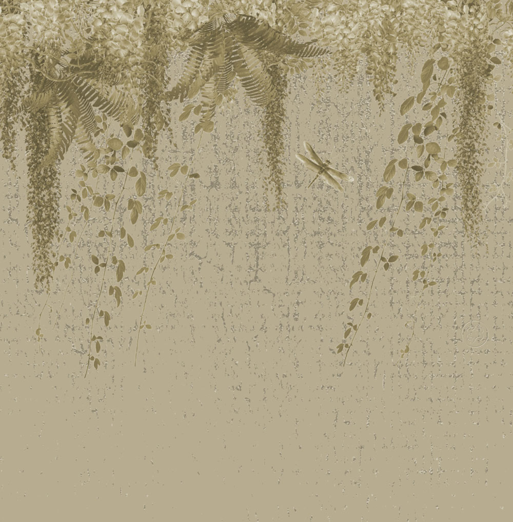 Luxury non-woven wall mural, climbing wisteria, fern and dragonflies motif.