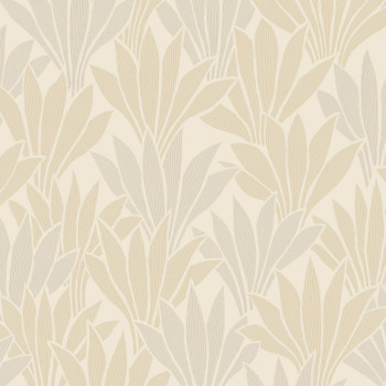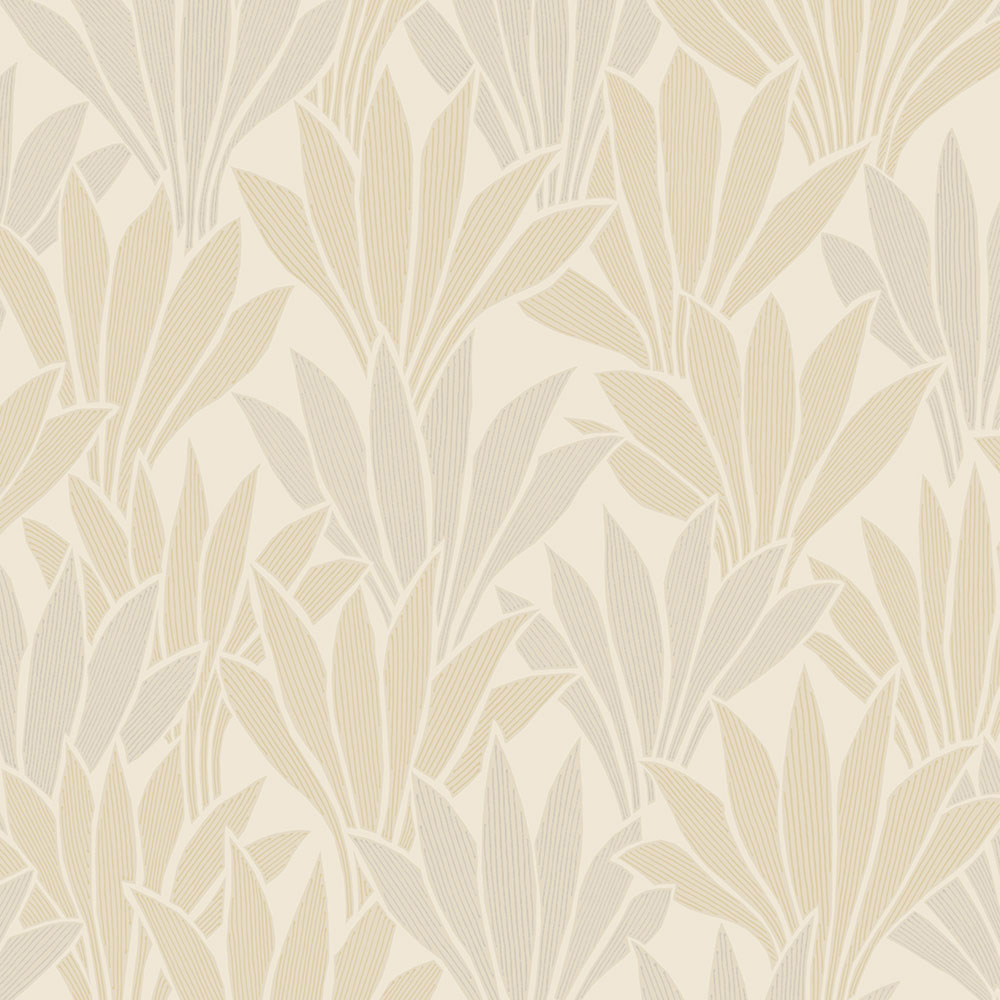 Finely textured non-woven wallpaper, shades of cream and beige, gold and pearl lines on the leaves.