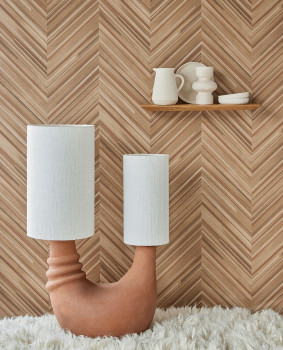 Finely textured non-woven wallpaper, shades of beige and brown, fine gold lines; Chevron / herringbone pattern.