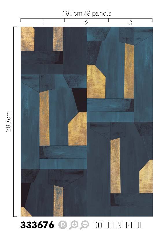 Non-woven wall mural/ wallpaper panel, shades of semi-gloss blue and gold with patina.