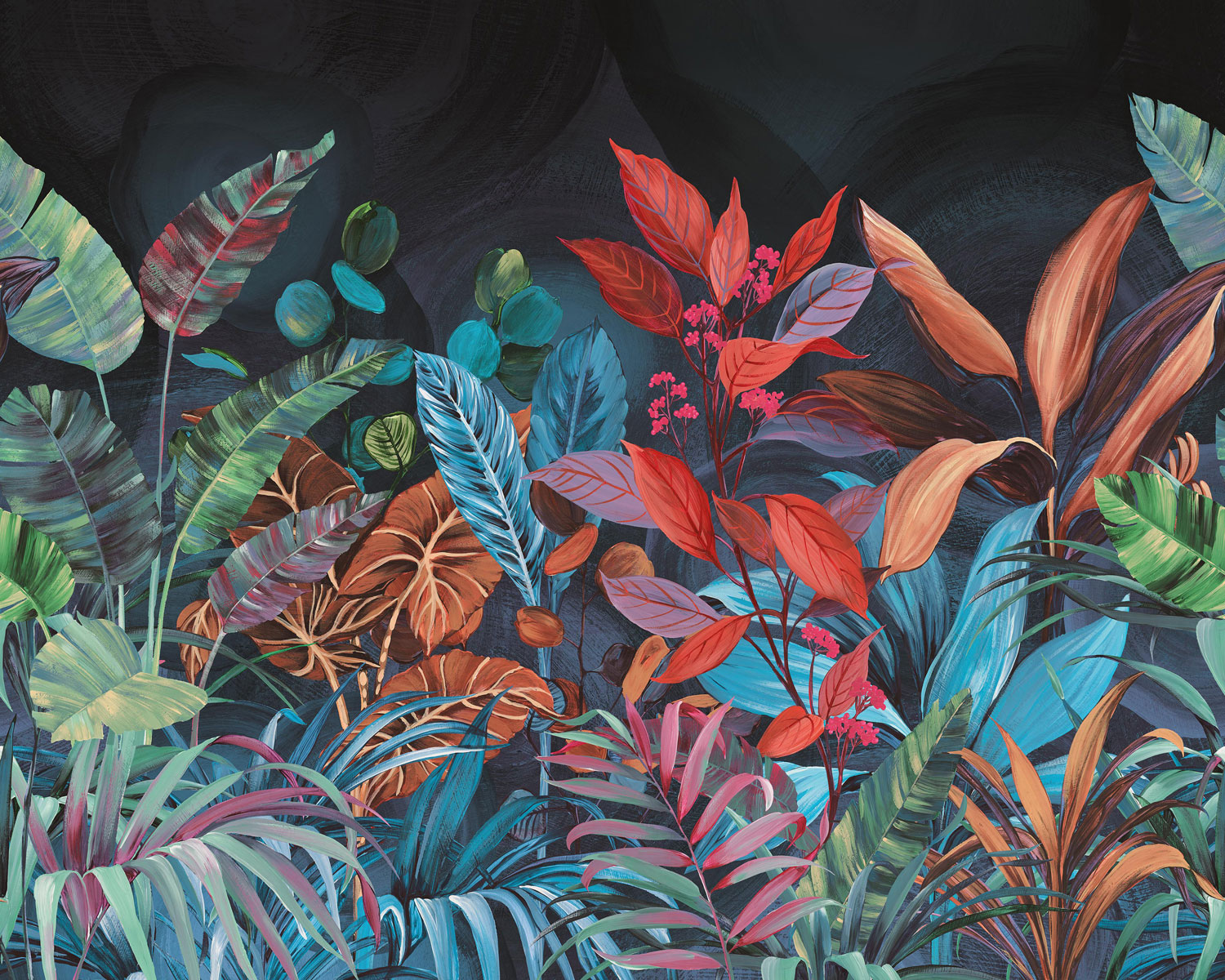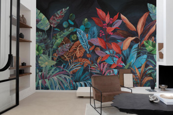 Non-woven wall mural, motifs of tropical leaves in colorful colors.