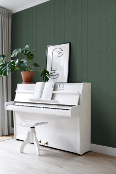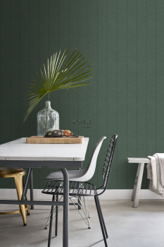 Smooth green non-woven wallpaper with a geometric pattern.