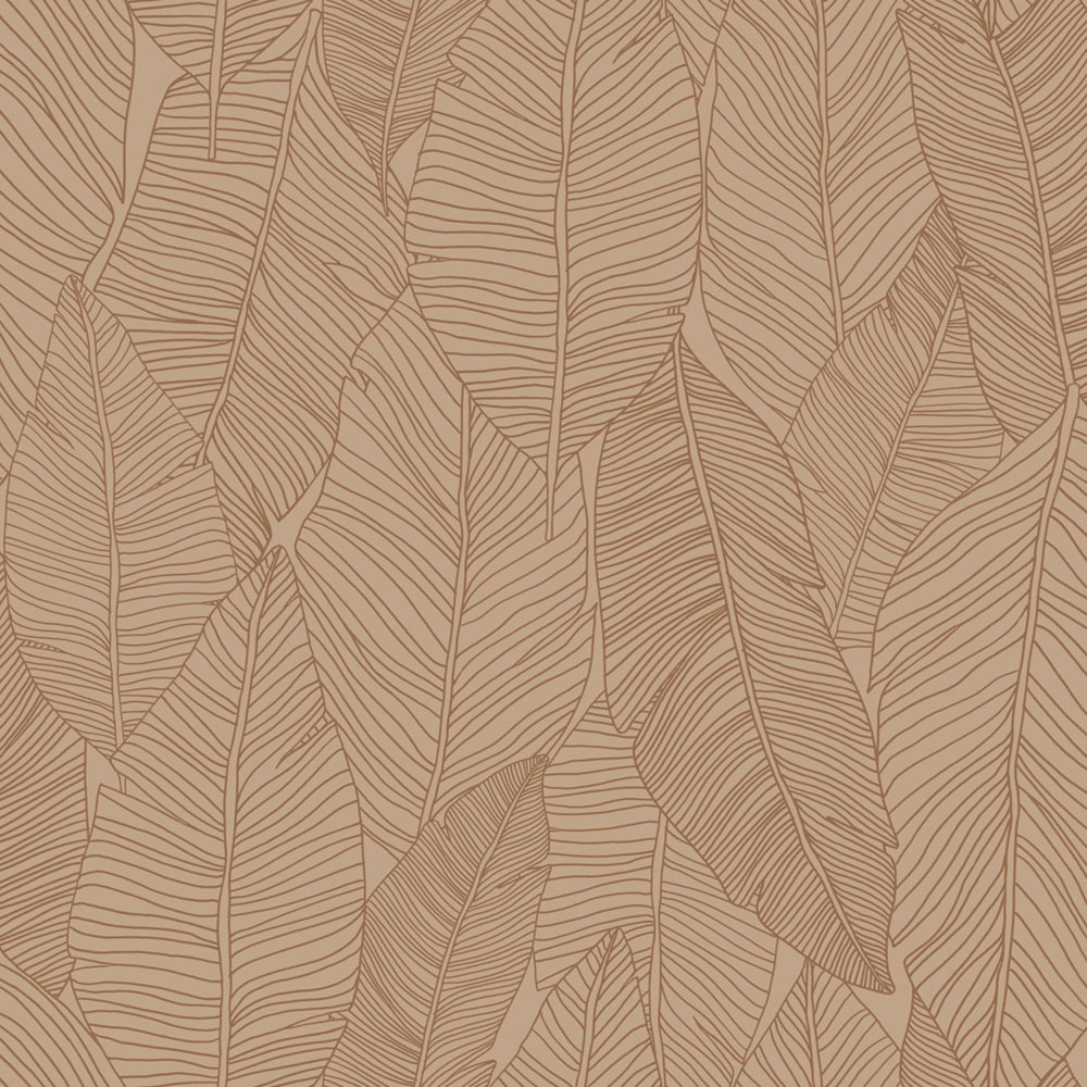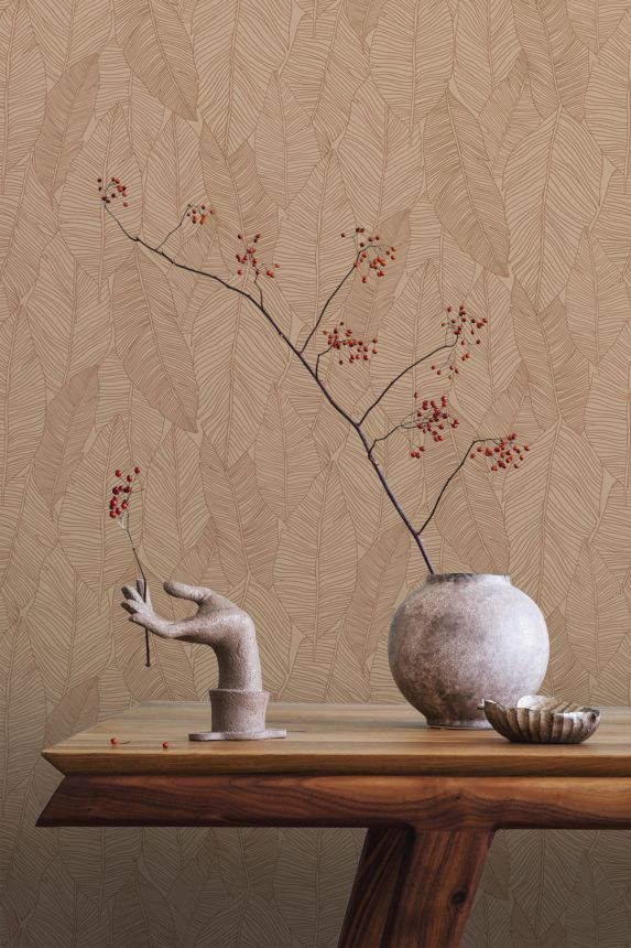 Smooth, brown, non-woven wallpaper, leaf outlines.