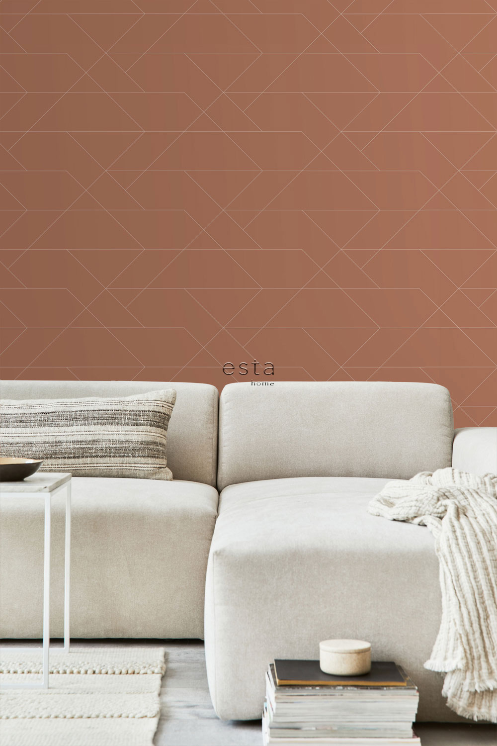 Smooth brown non-woven wallpaper, white lines create geometric patterns.