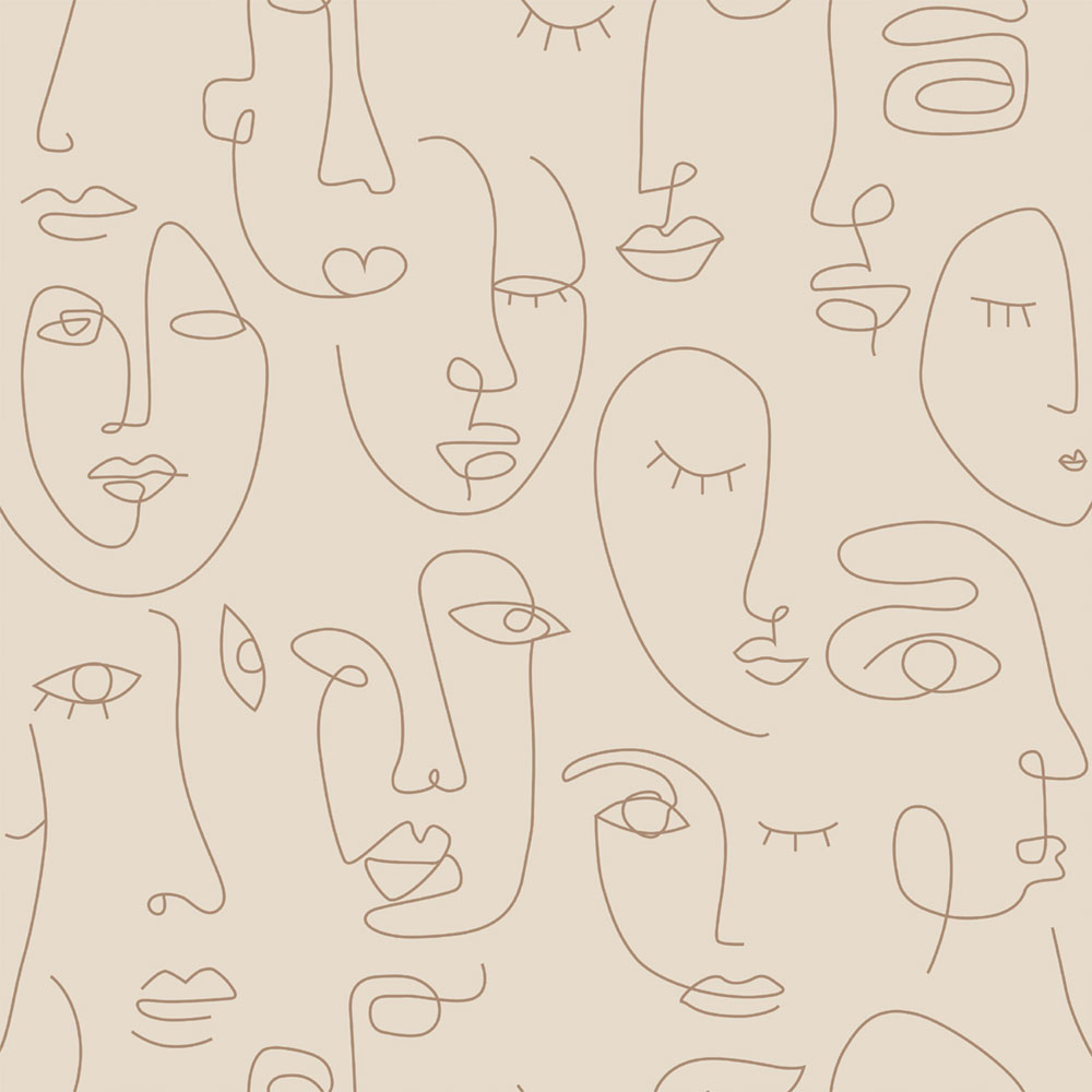Smooth beige graphic non-woven wallpaper, faces.