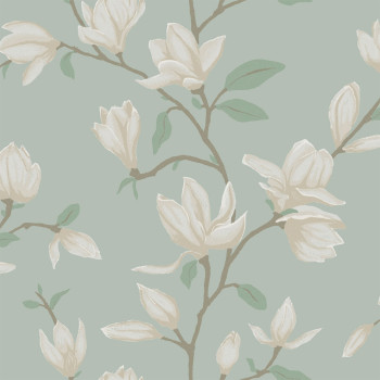 Smooth turquoise non-woven wallpaper, blooming magnolia.