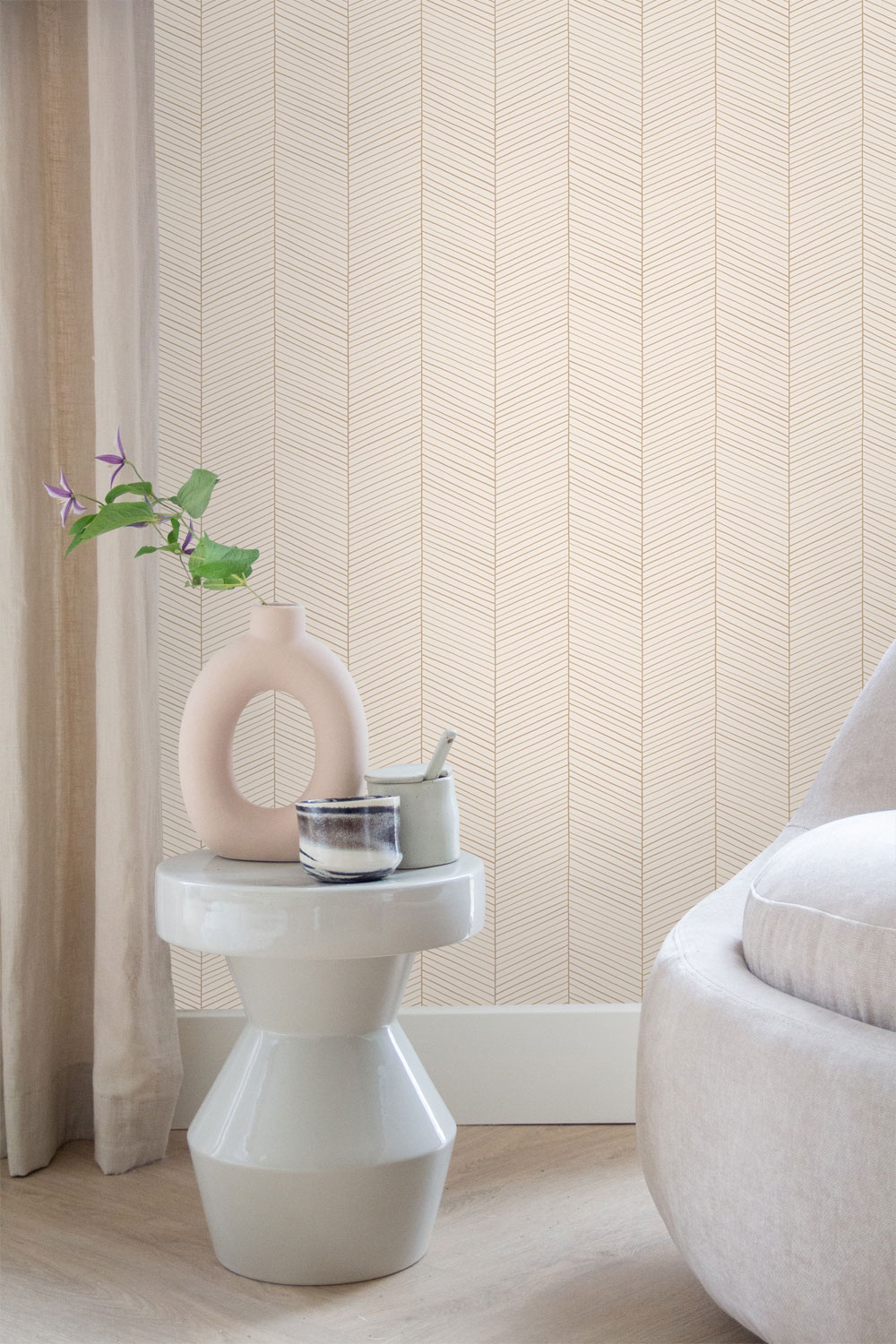 Smooth, cream non-woven wallpaper with geometric pattern.