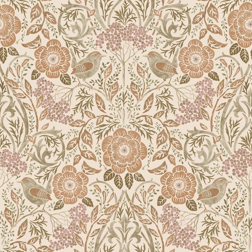 Smooth light beige non-woven wallpaper, rich pattern with flowers and birds in shades of green, brown and lavender.